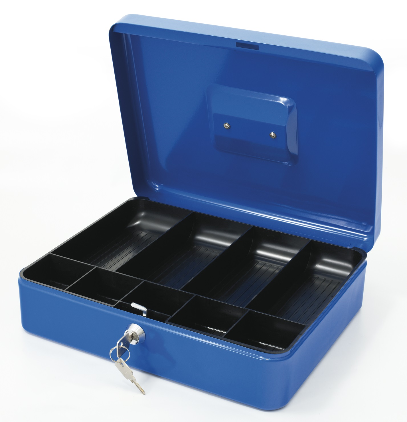univerzálna z kvalitnej ocele, hrúbka kovovej steny je 1 mm, uzamykateľná, dodáva sa s 2 kľúčmi, s kovovou pevnou rúčkou, s piatimi priehradkami na mince a 4 priehradkami na bankovky, priehradka sa dá vybrať, mix 3 farieb – modrá, červená, čierna